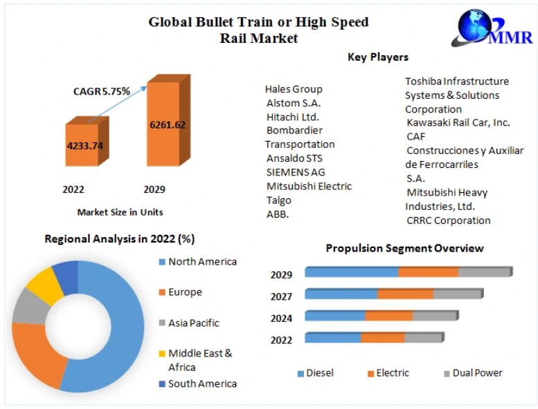 The Global Bullet Train / High-Speed Rail Market continues to gain momentum, with deployments expected to reach 6,261.62 units by 2029, rising from 4,233.74 units in 2022, at a CAGR of 5.75%. High-speed rail (HSR), characterized by operating speeds of 250 km/h and above, is rapidly transforming national transport systems by offering fast, reliable, and sustainable long-distance mobility.