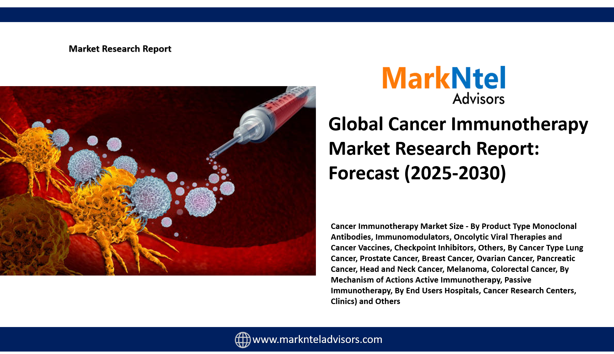 MarkNtel Advisors, a leading market research and consulting firm, has announced the release of its latest study titled Cancer Immunotherapy Market Research Report: Forecast (2025–2030). This report provides a detailed assessment of the Cancer Immunotherapy, covering its evolving dynamics, emerging trends, key growth drivers, major challenges, and competitive landscape.